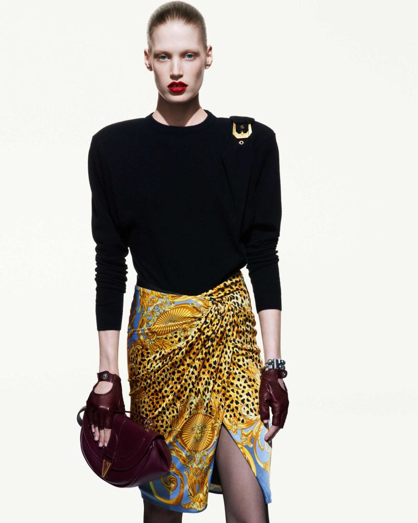 The Campaign featured pieces like playsuit, the classic Versace Barocco printed silk scarf jumpsuit, printed silk quilted jacket, high shoulder pad dress, high shoulder pad tops , leopard prints, etc.
