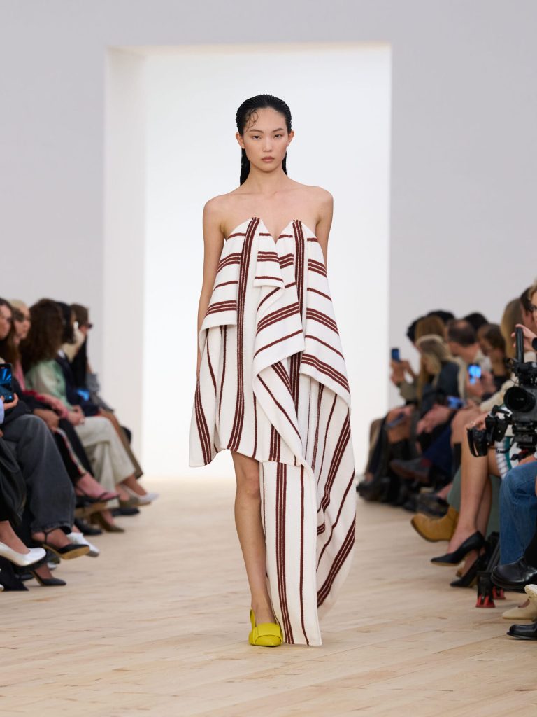 As we all know Loewe to be a risk taker, every single pieces are risky, edgy, and electrifying – but what stood out in the designs as edgy and busy they are, both creative hands knows where they are going with their designs – they did not waste time designing edgy pieces without clarity. There were some ruched raggish knitwear in the collection that looked so beautiful and trendy which speaks of how the brand is trying to make couture part of everyday wear. There are some sashed mini skirts, oversized jackets, denim, layered dresses, sculptural leather cocktail dresses etc.