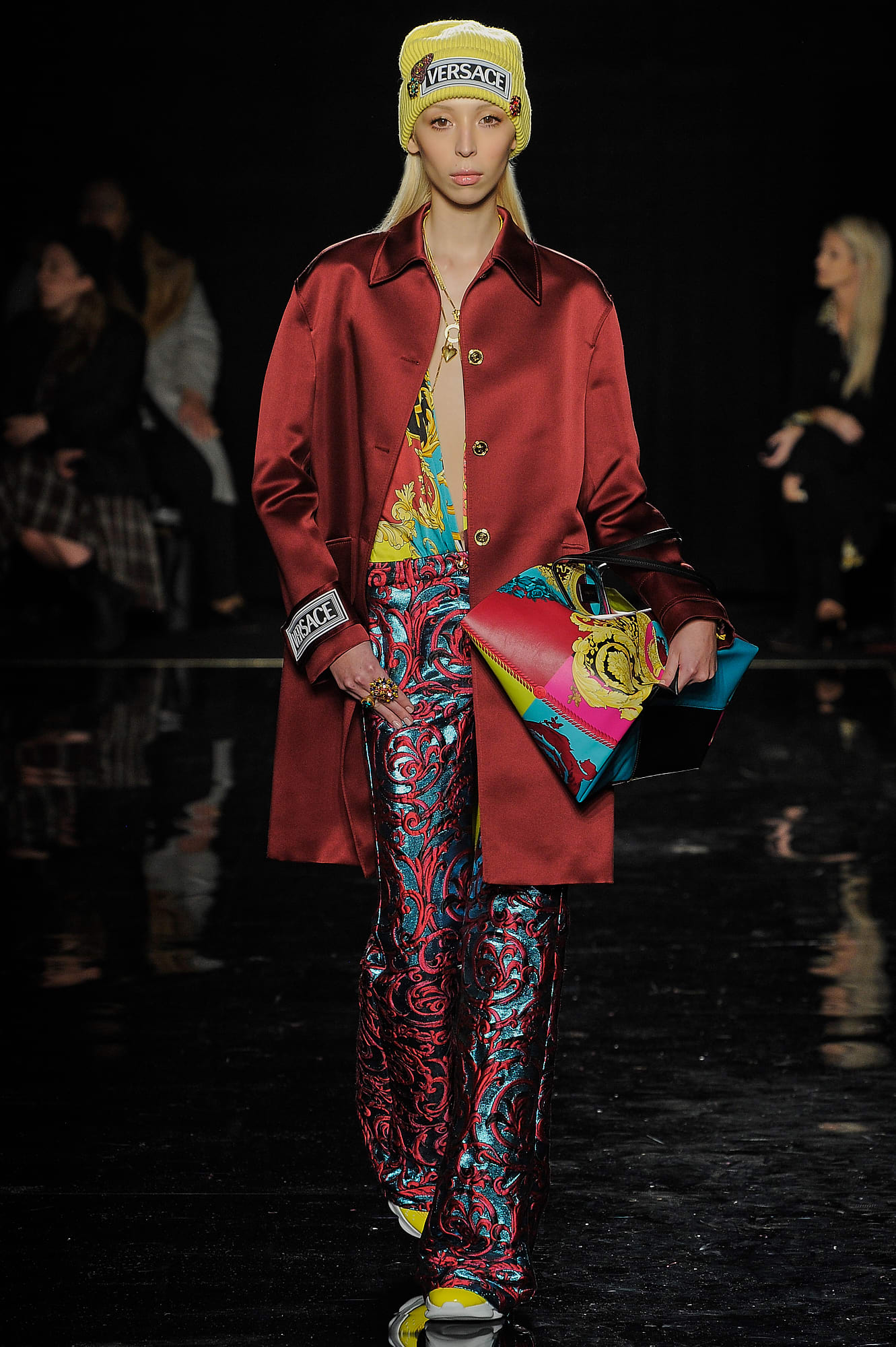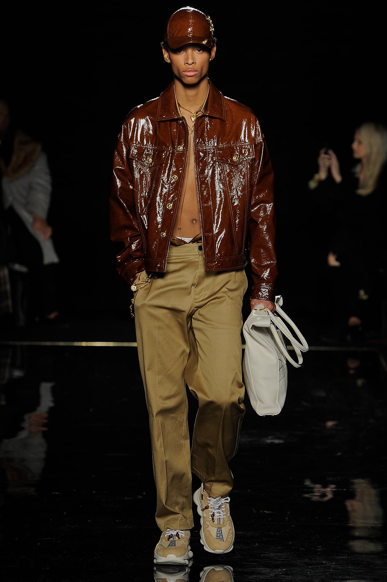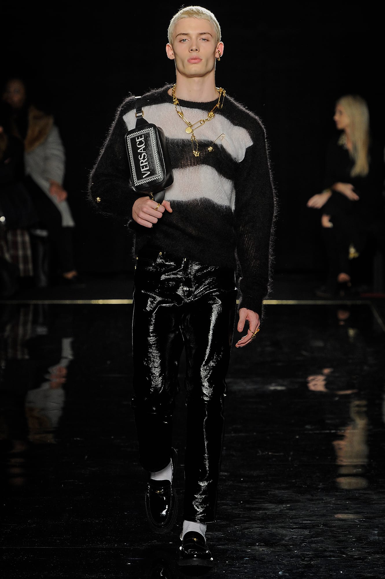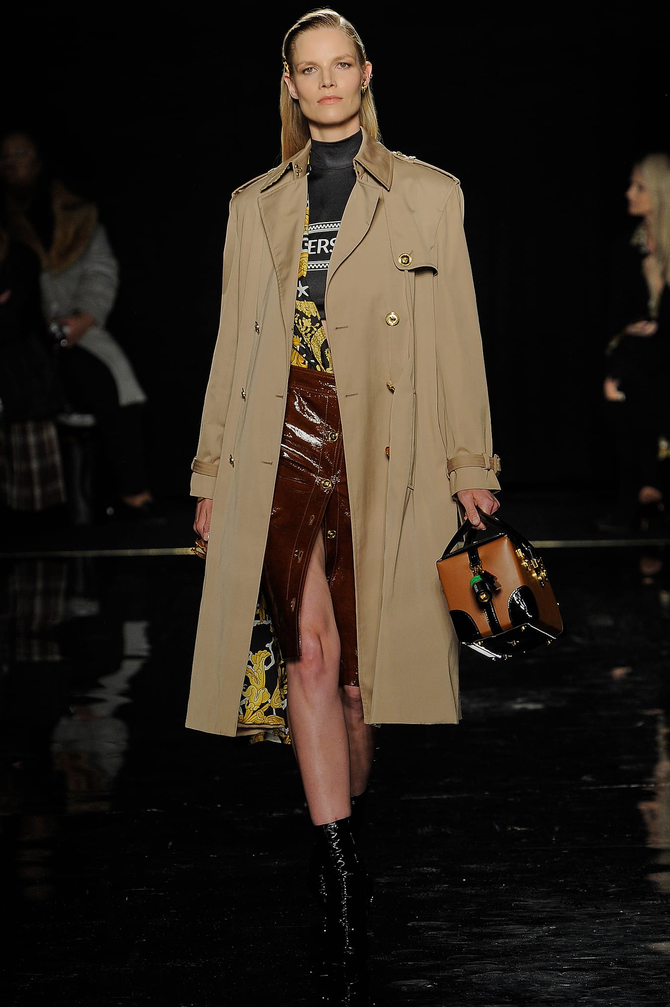 The opening looks, as well as several dispersed throughout the lineup, had a decidedly “power woman” feel, like a burgundy vinyl overcoat, a classic trench, buttery leather knee-high boots and tailored all-black suiting, complete with Versace signature touches like safety pins and gold buttons. This New York lady-on-the-go story was developed even further when models rolled logo-emblazoned status luggage down the runway, or carried giant duffle or tote bags under their arms — all highly practical for days and nights spent running around town.
