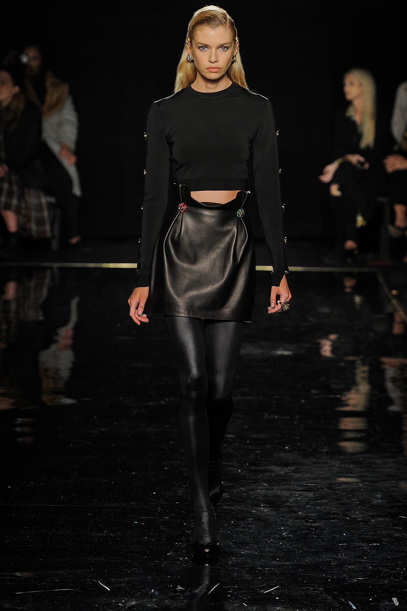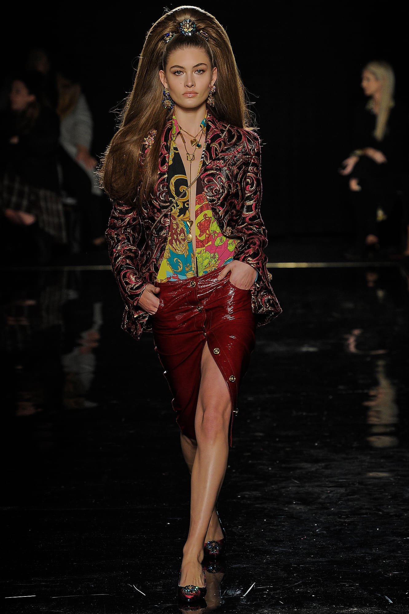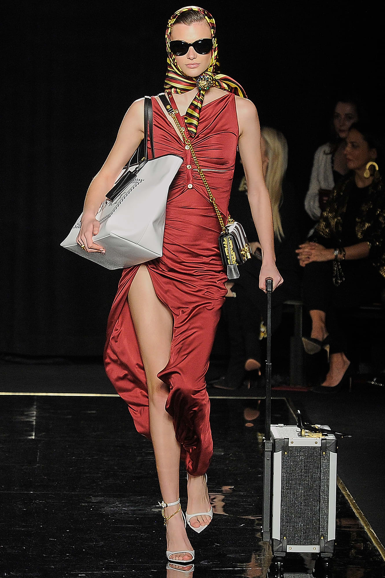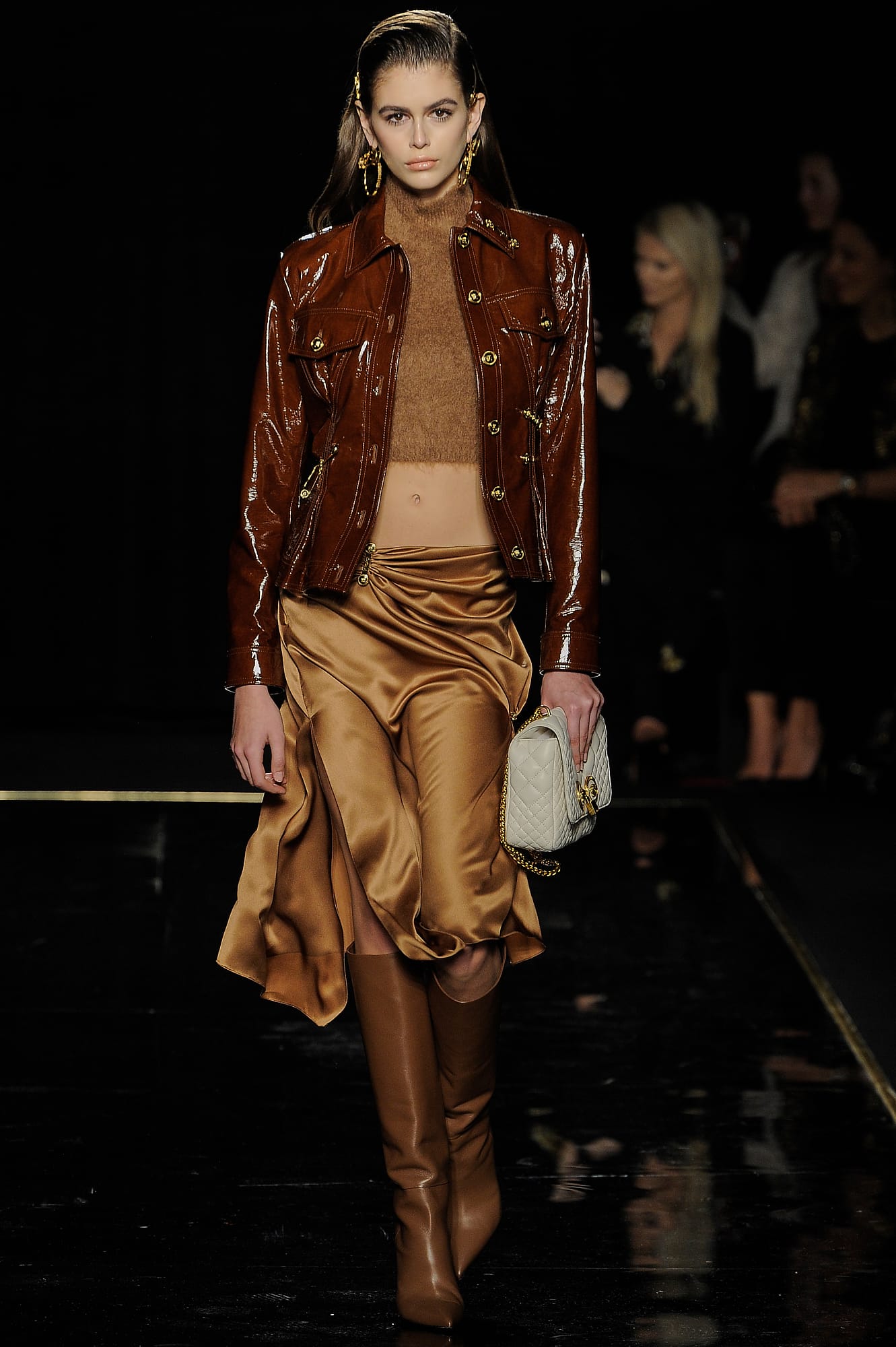 The opening looks, as well as several dispersed throughout the lineup, had a decidedly “power woman” feel, like a burgundy vinyl overcoat, a classic trench, buttery leather knee-high boots and tailored all-black suiting, complete with Versace signature touches like safety pins and gold buttons. This New York lady-on-the-go story was developed even further when models rolled logo-emblazoned status luggage down the runway, or carried giant duffle or tote bags under their arms — all highly practical for days and nights spent running around town.