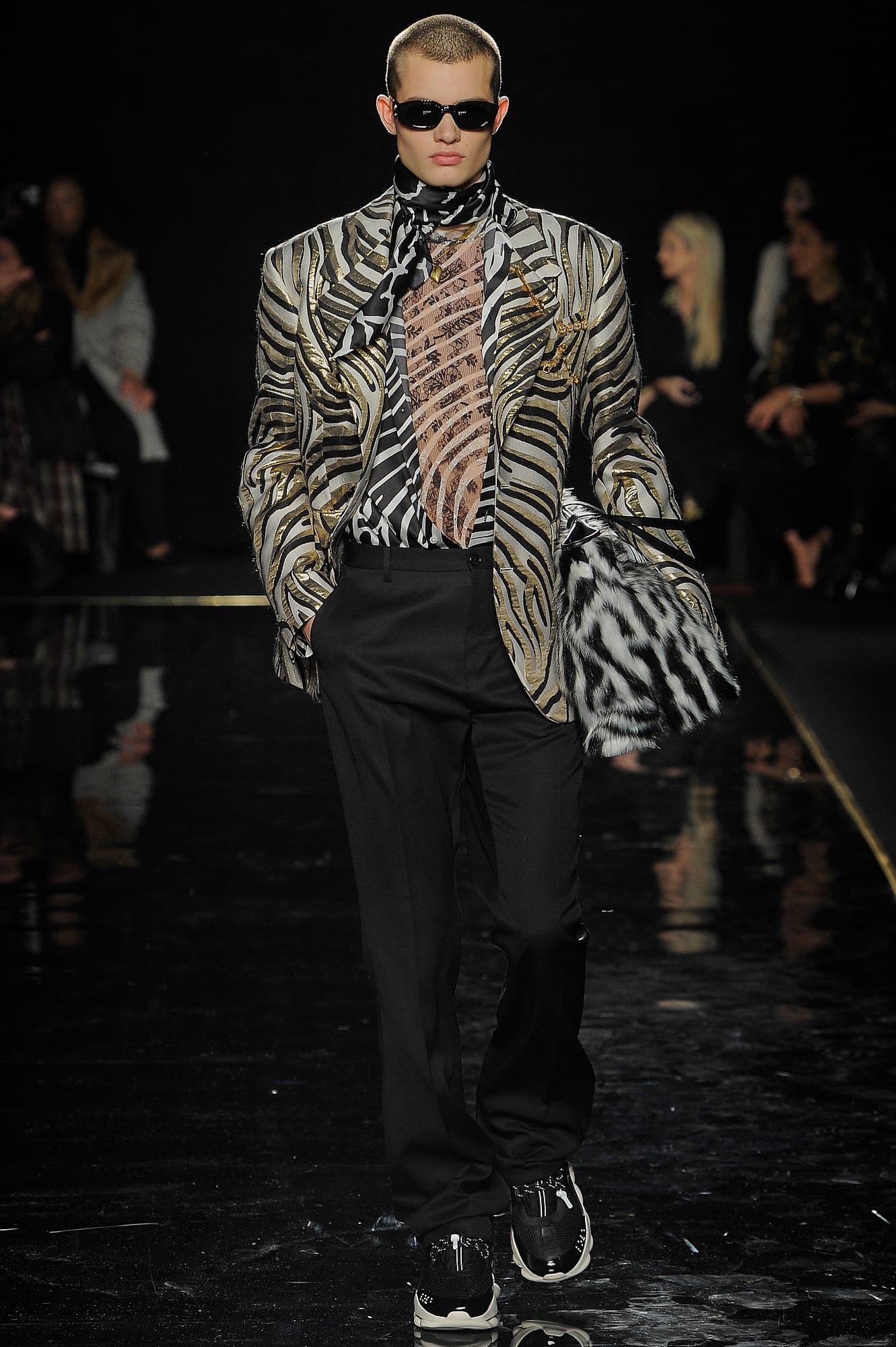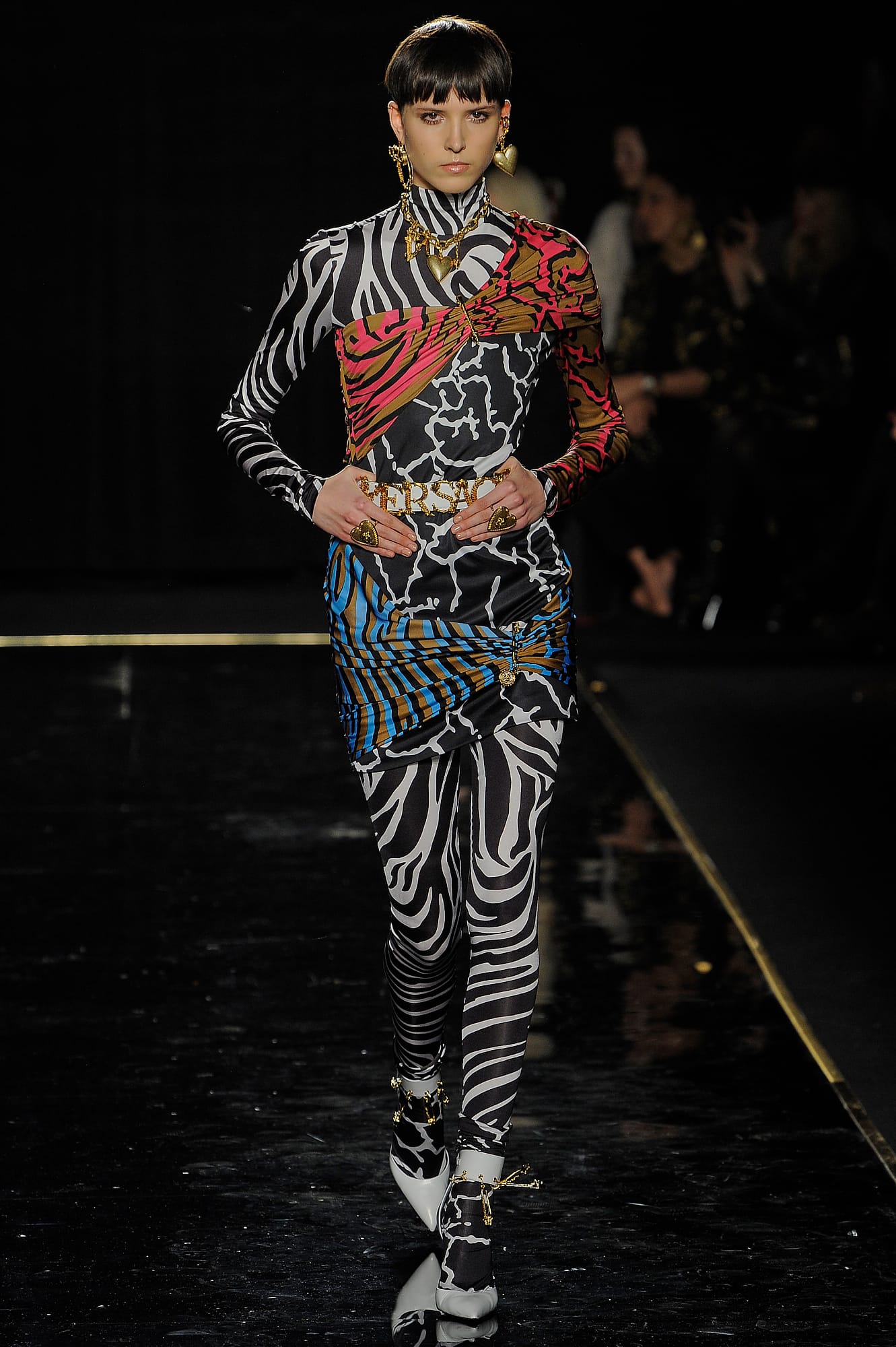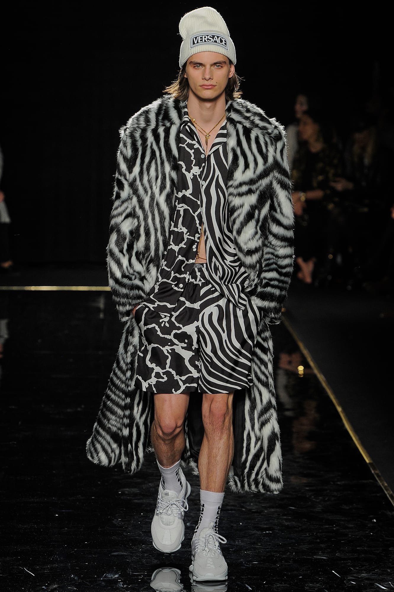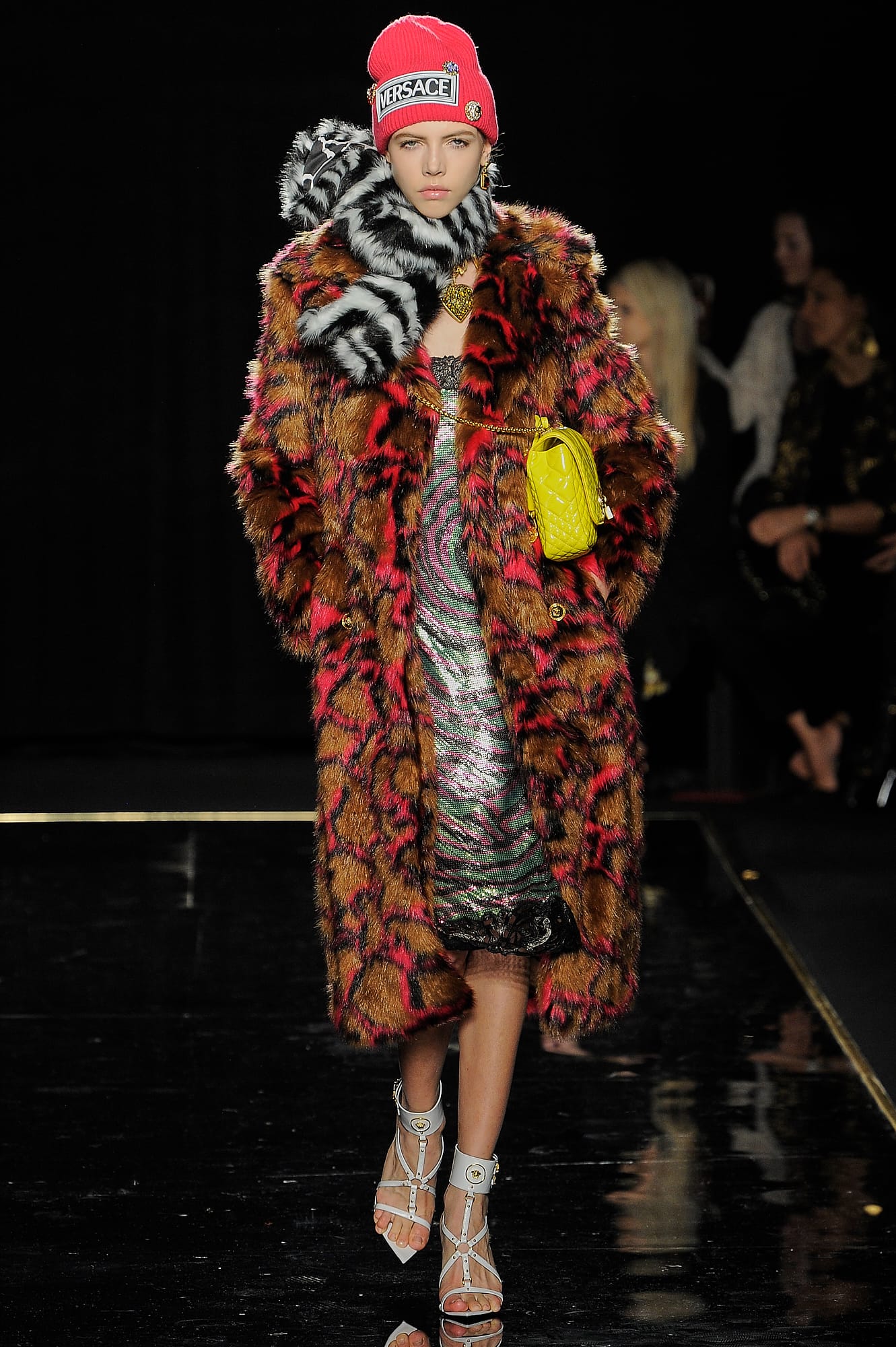 This season, Versace took the animal print motif very seriously, too, with every conceivable animal print represented throughout the collection: Zebra stripes appeared on leggings, turtlenecks, mini-skirts, party dresses and more, while a giraffe-like spotting covered coats, ankle boots and a shiny blazer. While some models were styled with silk headscarves and large sunglasses, or comically large teased hair adorned with jewels, others looked more suited for a walk down Saint Marks (Marjan Jonkman in a slime green and hot pink sweater) or a stroll in SoHo, thanks to youthful puffer jackets and bright faux-fur coats, fuzzy sweaters, logo beanies, men’s chest bags, sneakers, lots of leather and basic white tees emblazoned with the brand’s name. One T-shirt in particular, an “I Love NY” tee mashed up with a gilded Versace Medusa logo (worn by Mica Arganaraz), will likely prove to be as popular in the neighbourhood as anything peddled by Supreme.