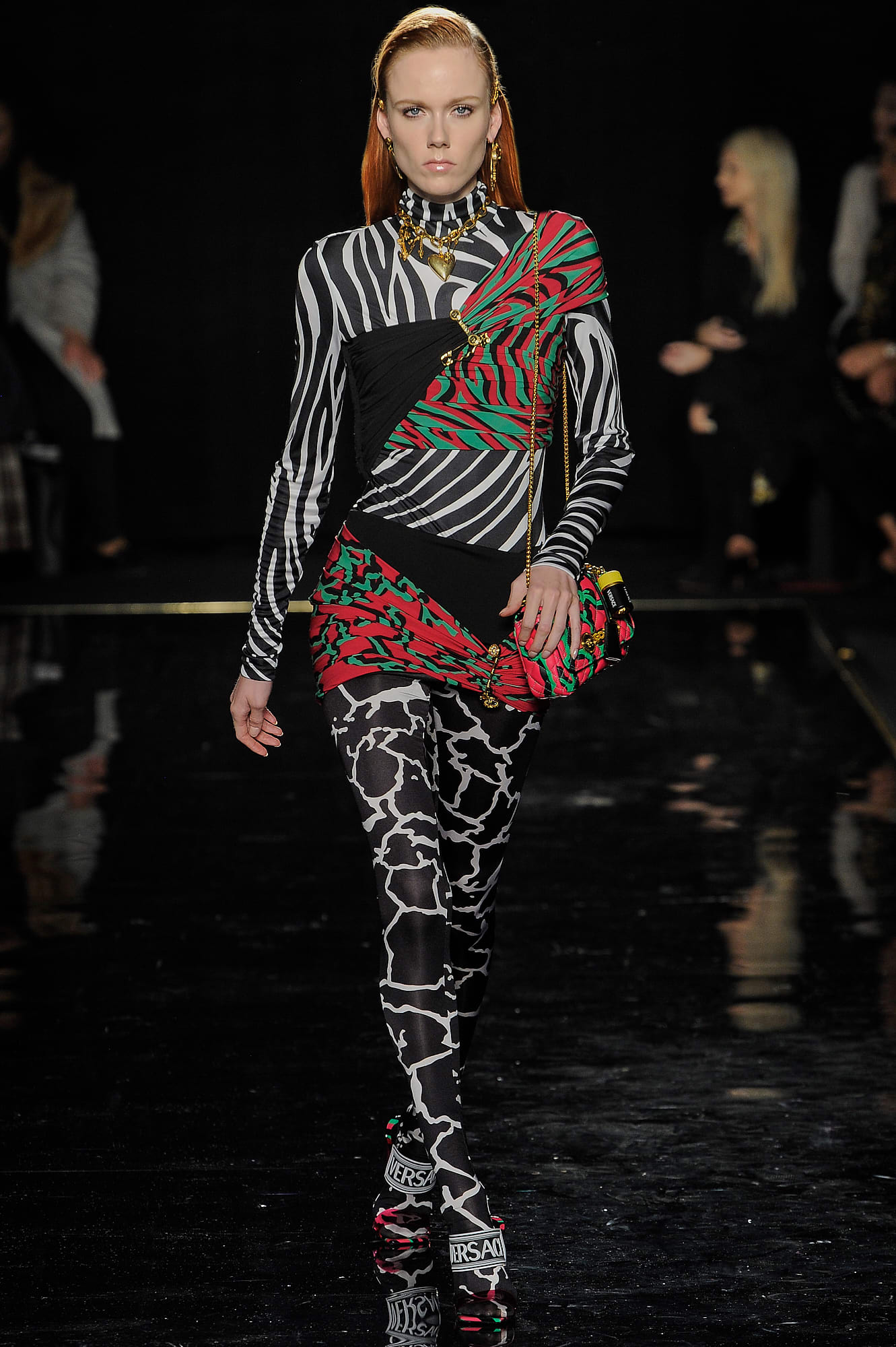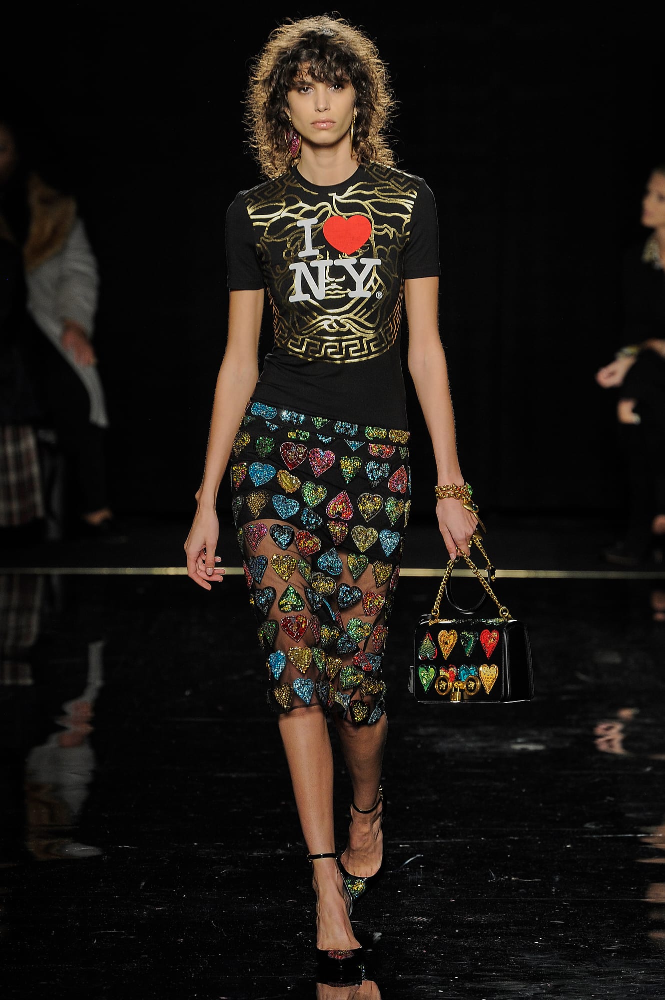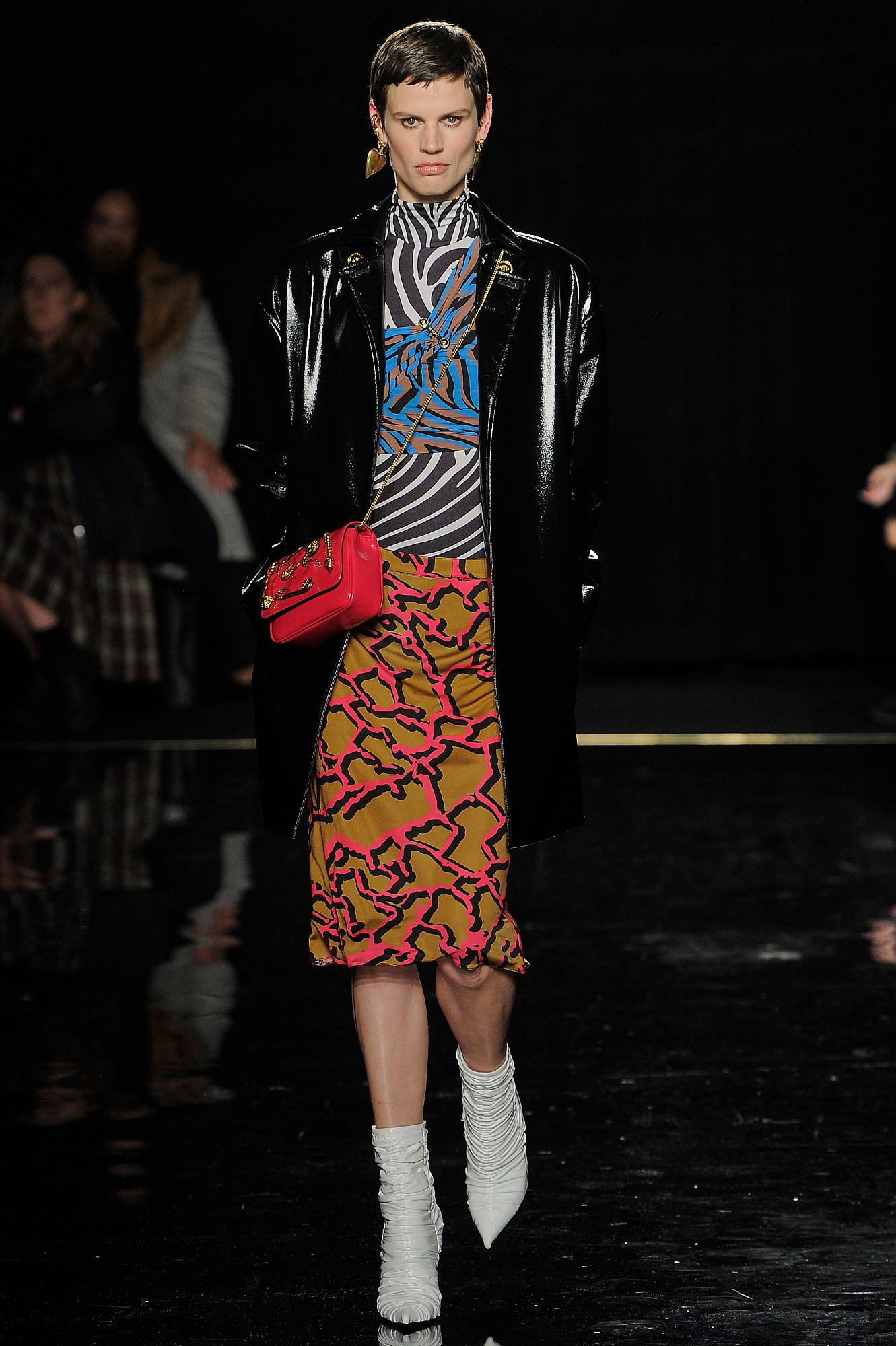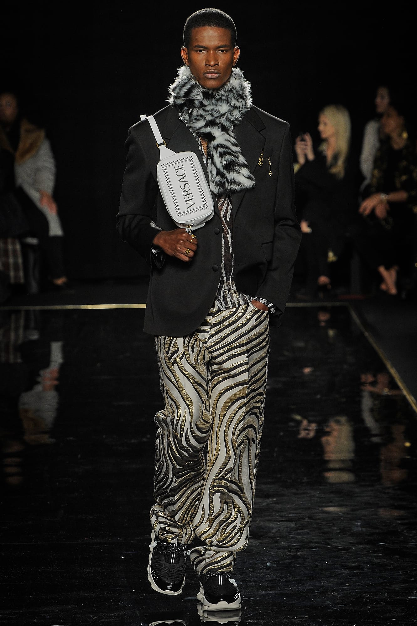 This season, Versace took the animal print motif very seriously, too, with every conceivable animal print represented throughout the collection: Zebra stripes appeared on leggings, turtlenecks, mini-skirts, party dresses and more, while a giraffe-like spotting covered coats, ankle boots and a shiny blazer. While some models were styled with silk headscarves and large sunglasses, or comically large teased hair adorned with jewels, others looked more suited for a walk down Saint Marks (Marjan Jonkman in a slime green and hot pink sweater) or a stroll in SoHo, thanks to youthful puffer jackets and bright faux-fur coats, fuzzy sweaters, logo beanies, men’s chest bags, sneakers, lots of leather and basic white tees emblazoned with the brand’s name. One T-shirt in particular, an “I Love NY” tee mashed up with a gilded Versace Medusa logo (worn by Mica Arganaraz), will likely prove to be as popular in the neighbourhood as anything peddled by Supreme.