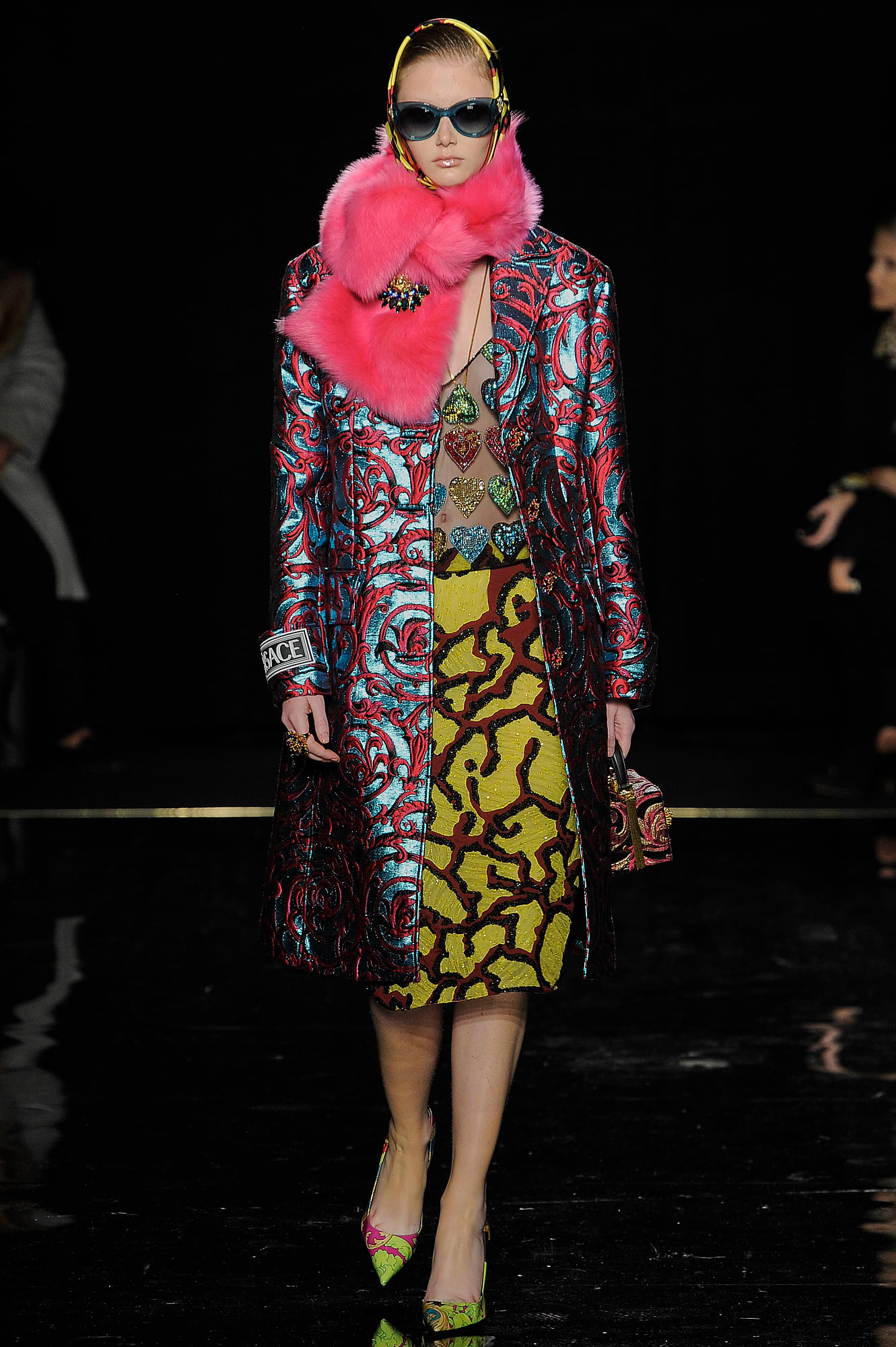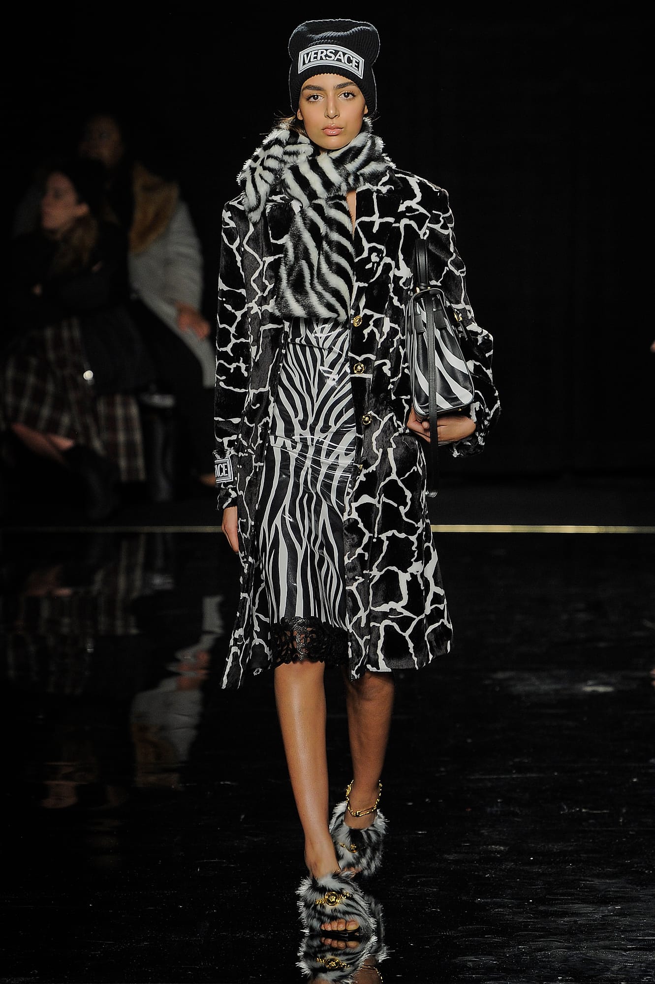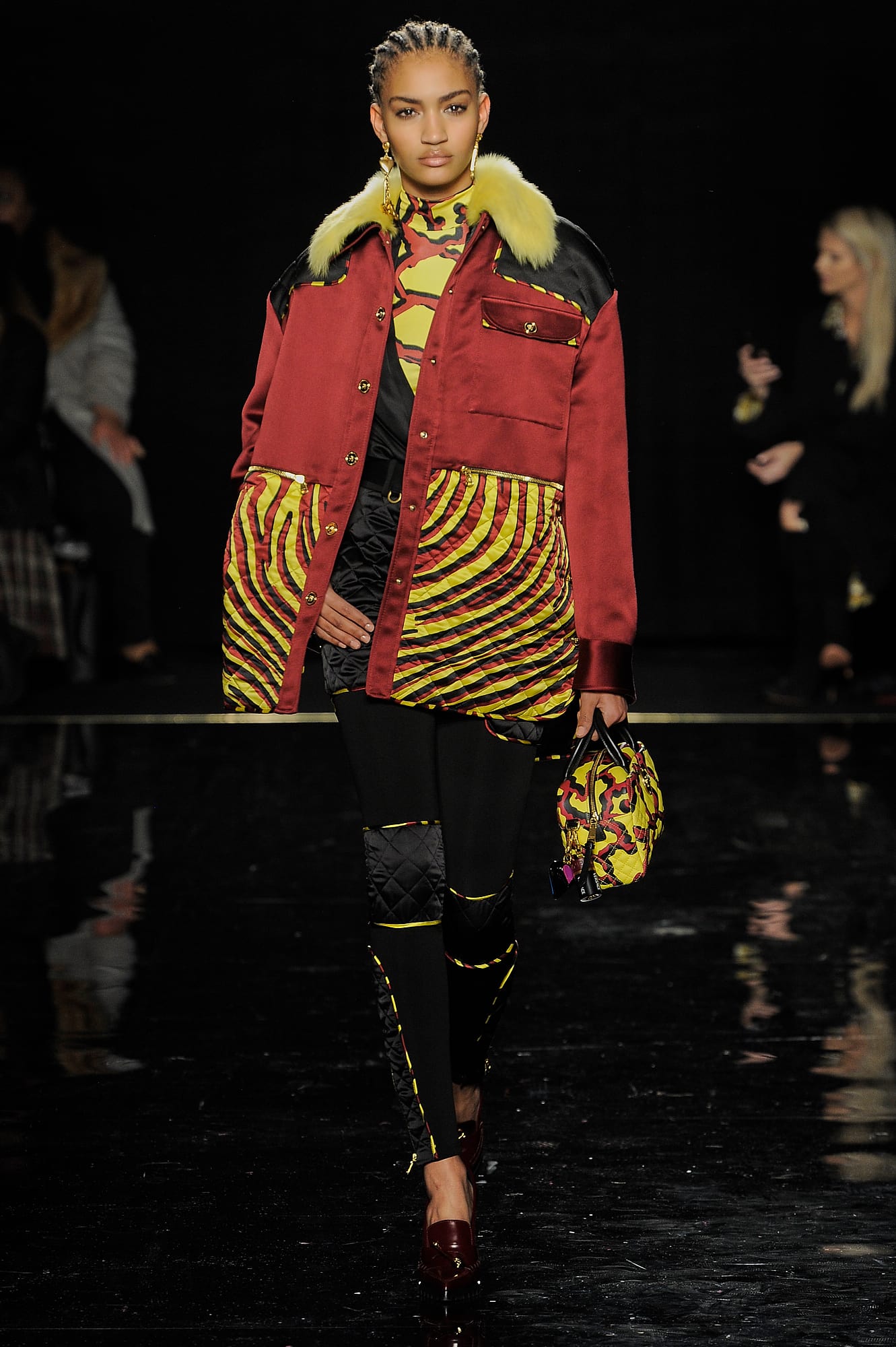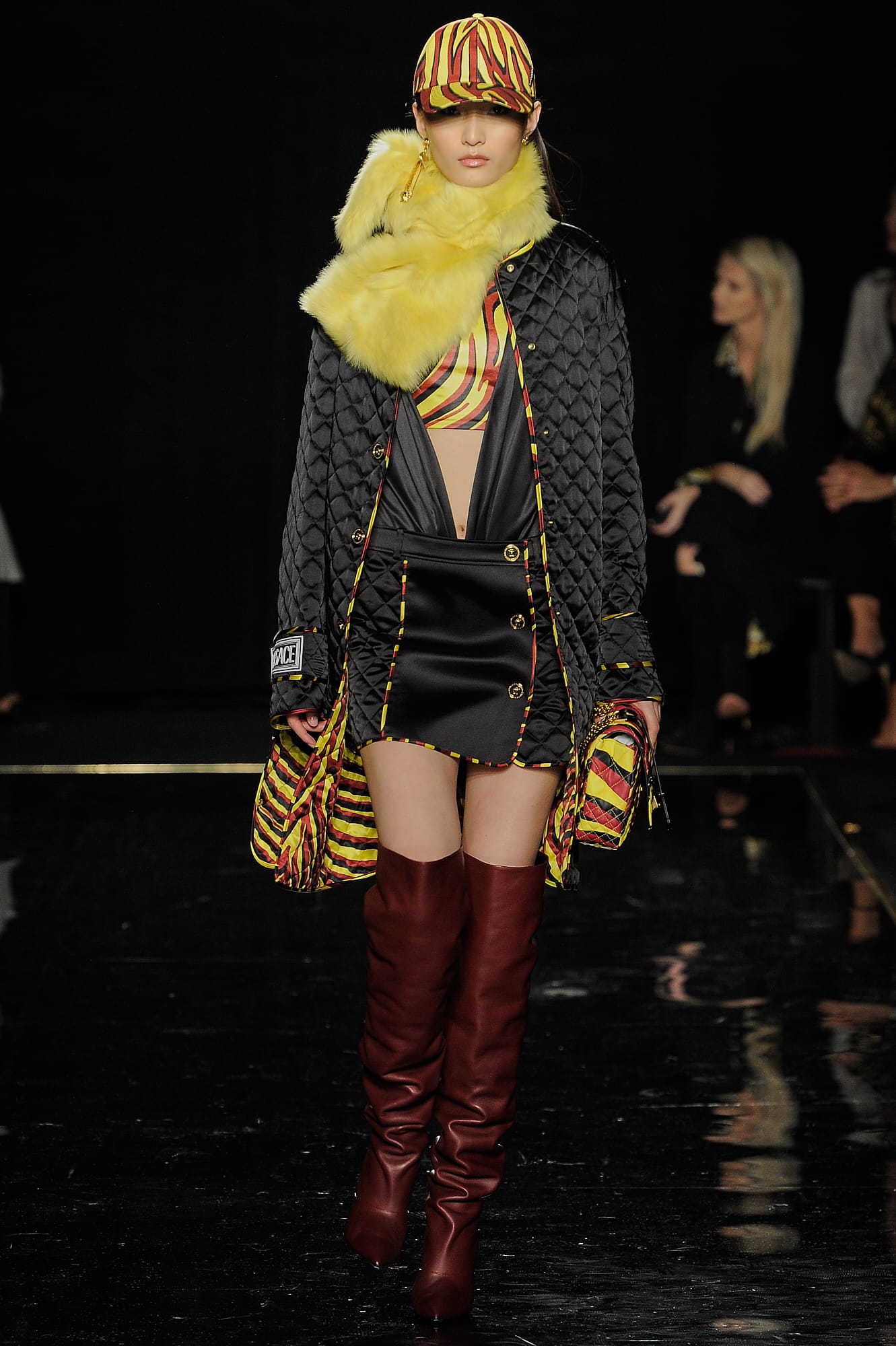 This season, Versace took the animal print motif very seriously, too, with every conceivable animal print represented throughout the collection: Zebra stripes appeared on leggings, turtlenecks, mini-skirts, party dresses and more, while a giraffe-like spotting covered coats, ankle boots and a shiny blazer. While some models were styled with silk headscarves and large sunglasses, or comically large teased hair adorned with jewels, others looked more suited for a walk down Saint Marks (Marjan Jonkman in a slime green and hot pink sweater) or a stroll in SoHo, thanks to youthful puffer jackets and bright faux-fur coats, fuzzy sweaters, logo beanies, men’s chest bags, sneakers, lots of leather and basic white tees emblazoned with the brand’s name. One T-shirt in particular, an “I Love NY” tee mashed up with a gilded Versace Medusa logo (worn by Mica Arganaraz), will likely prove to be as popular in the neighbourhood as anything peddled by Supreme.