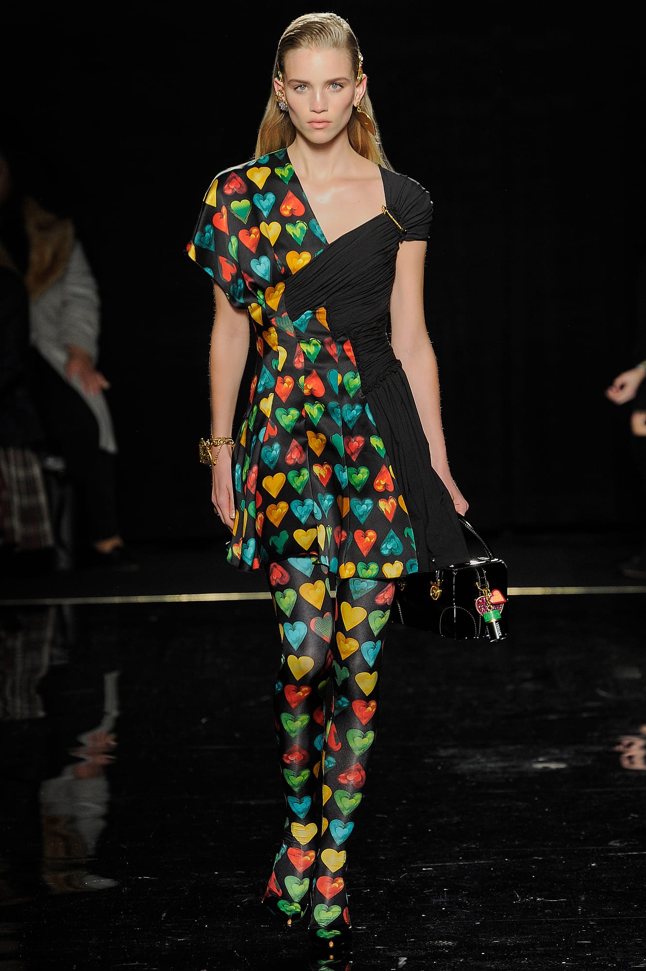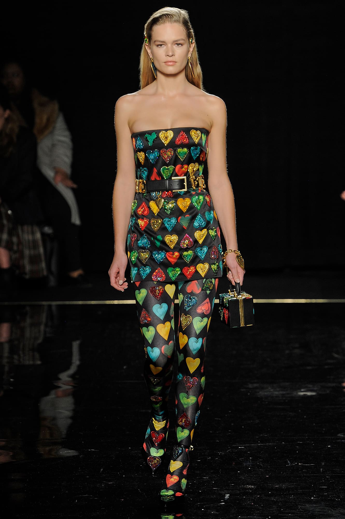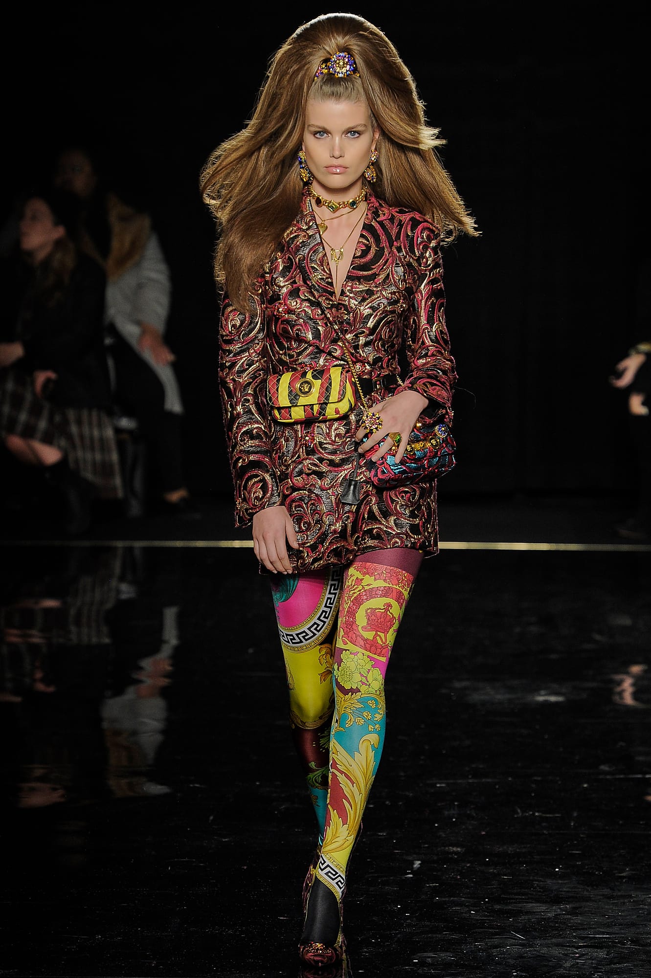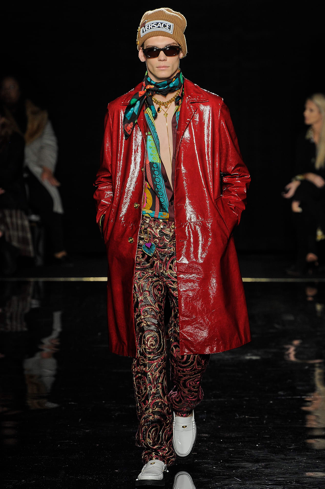 This season, Versace took the animal print motif very seriously, too, with every conceivable animal print represented throughout the collection: Zebra stripes appeared on leggings, turtlenecks, mini-skirts, party dresses and more, while a giraffe-like spotting covered coats, ankle boots and a shiny blazer. While some models were styled with silk headscarves and large sunglasses, or comically large teased hair adorned with jewels, others looked more suited for a walk down Saint Marks (Marjan Jonkman in a slime green and hot pink sweater) or a stroll in SoHo, thanks to youthful puffer jackets and bright faux-fur coats, fuzzy sweaters, logo beanies, men’s chest bags, sneakers, lots of leather and basic white tees emblazoned with the brand’s name. One T-shirt in particular, an “I Love NY” tee mashed up with a gilded Versace Medusa logo (worn by Mica Arganaraz), will likely prove to be as popular in the neighbourhood as anything peddled by Supreme.