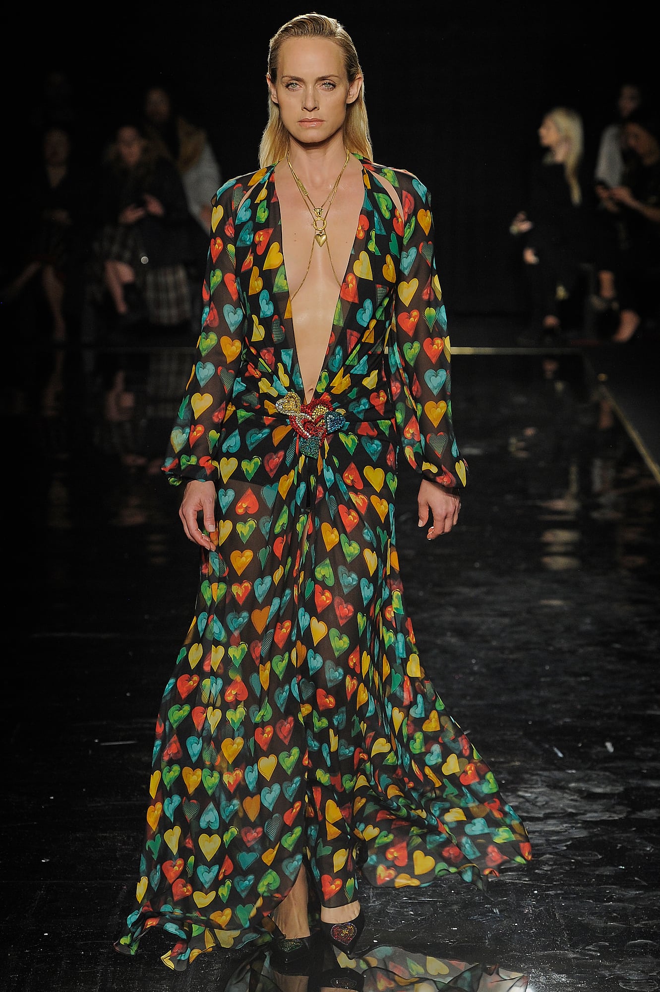 Donatella dipped into the nostalgia well, especially when it came to a duo of statement dresses: the black safety pin dress from Spring 1994 made famous by Elizabeth Hurley, along with the barely-there gown worn by Jennifer Lopez to the Grammys in 2000, this time done up in hearts. (Fun fact: The latter was modelled on the runway this season by Amber Valletta, who also modelled the Spring 2000 original.) In addition to these iconic throwbacks, the show featured countless multi-coloured prints that were unmistakably Versace, no matter if you’re in New York, Milan or anywhere else in the world.